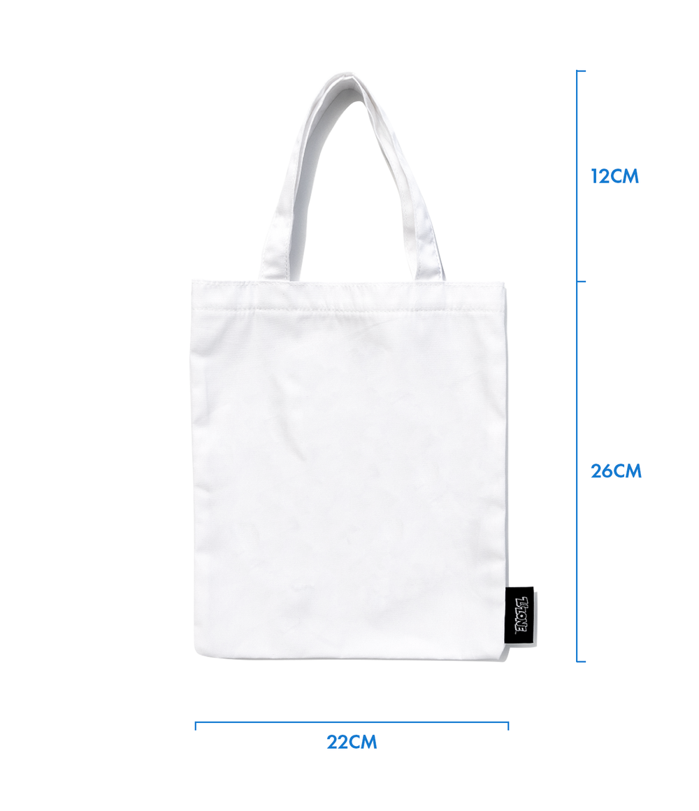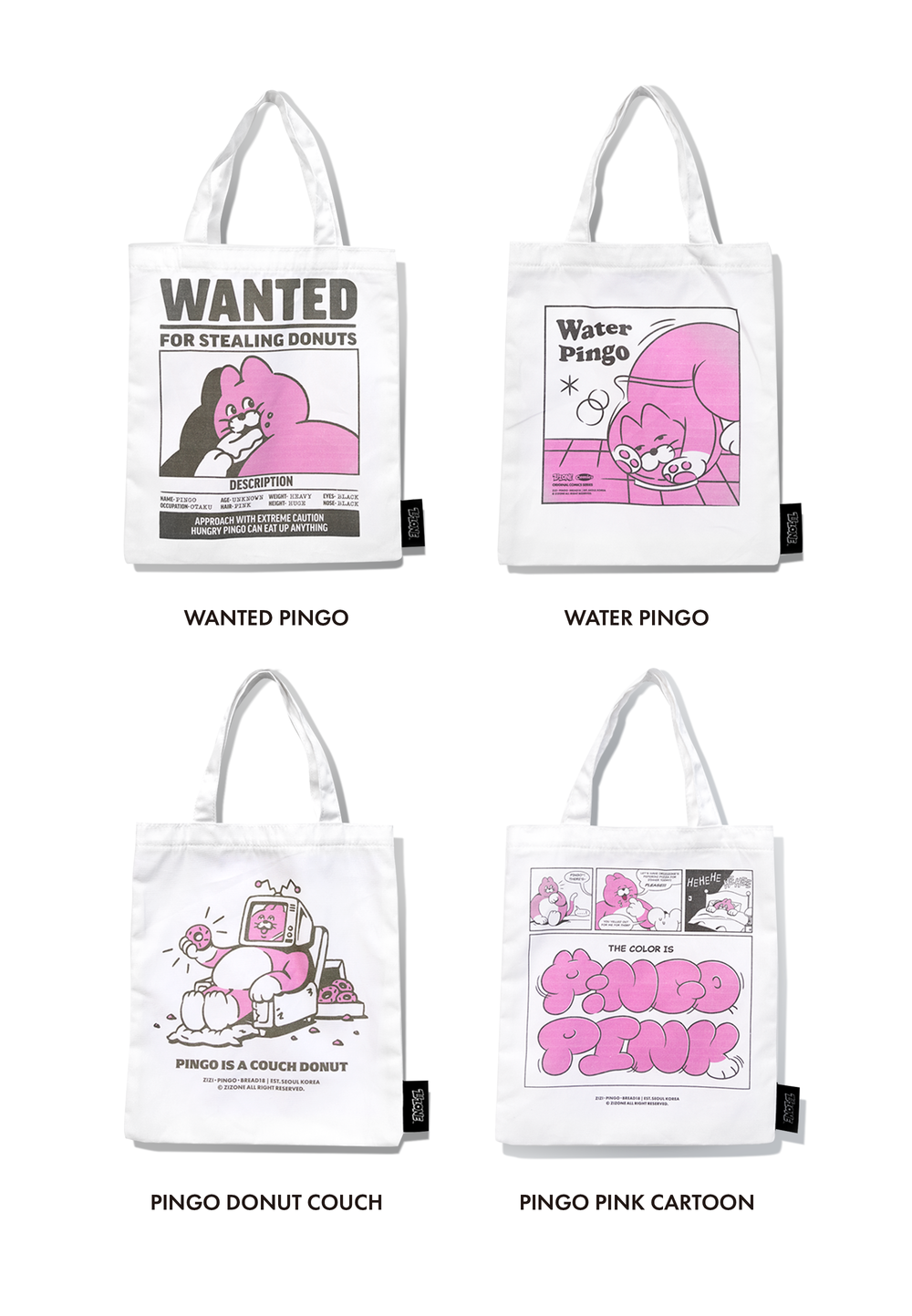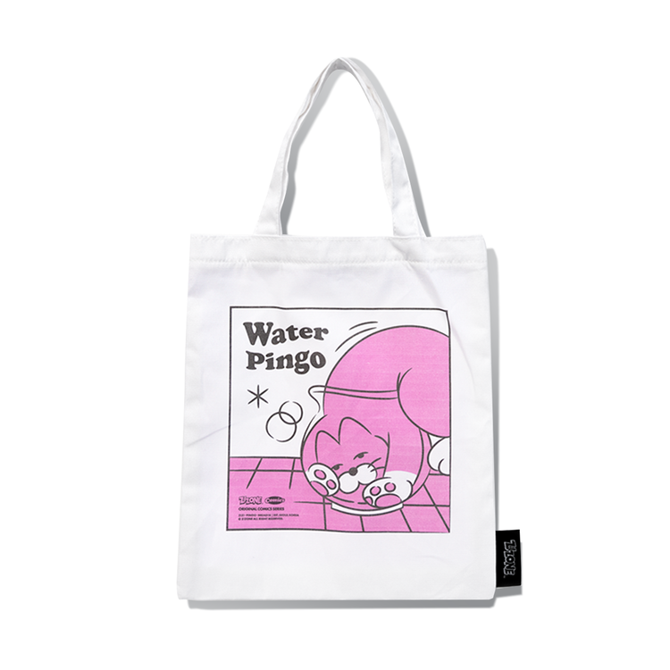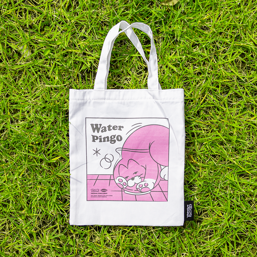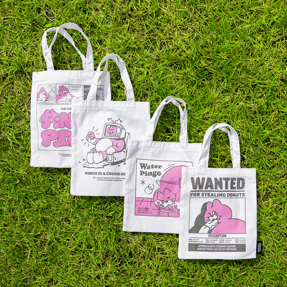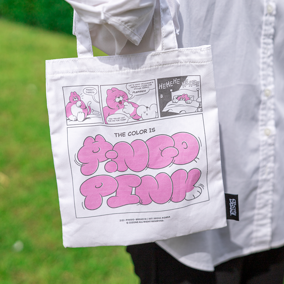 The cartoon and artwork images of Zizone's representative character, Pingo, is printed in pink and black on this mini eco bag.